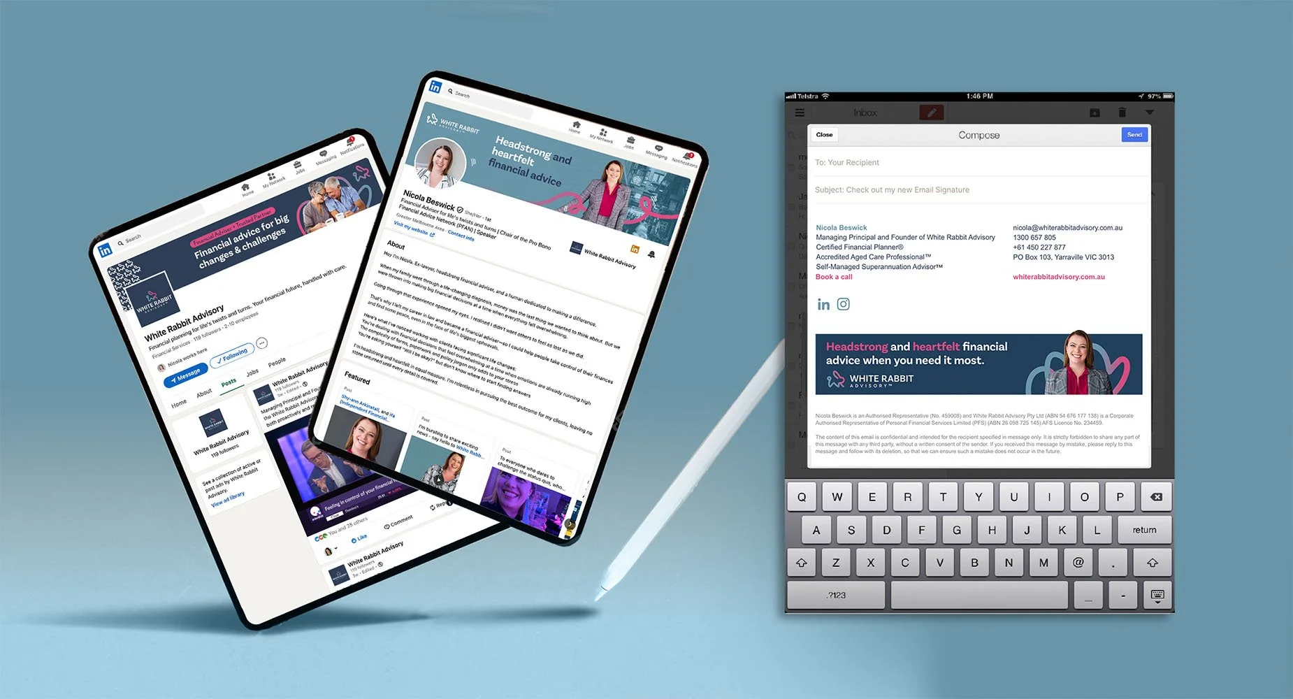 Everything works stylishly together - From the website to online profiles to email signatures to document covers and business cards - it’s a seamless and consistent brand experience. No Frankenstein branding here. This integrated approach to financial adviser marketing means every touchpoint reinforces the same message and builds trust.